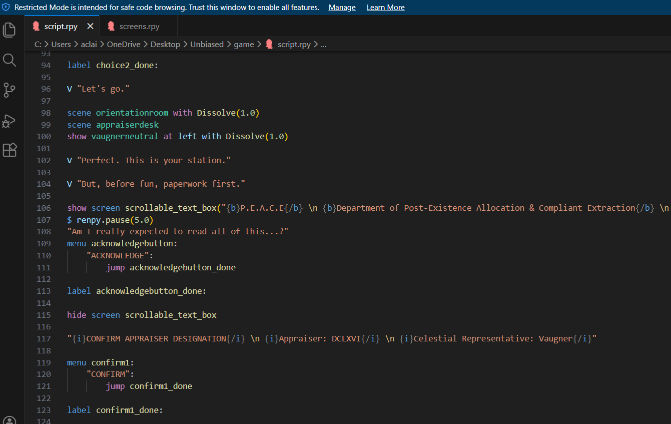 But when I wanted to make a commercial game, I knew my skills in RPG Maker wouldn't really be enough, and so I went to Ren'Py. I'm more of a writer, anyway, so a narrative-driven story felt right. And I heard using Python in Ren'Py was "easier" for people... and honestly? So far it has been a breeze! It's cool to see the game slowly come to life.